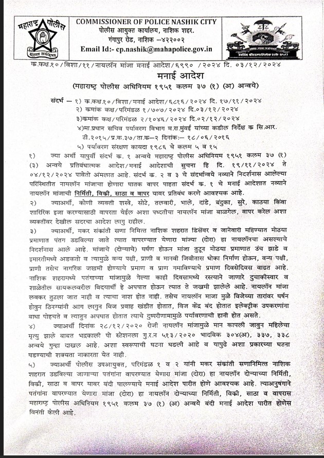 महाराष्ट्र शासनाने पतंगोत्सवाच्या हंगामात नायलॉन मांजामुळे होणाऱ्या गंभीर दुर्घटनांना आळा घालण्यासाठी कठोर पावले उचलली आहेत. 3 डिसेंबर 2024 रोजी महाराष्ट्र सरकारने नायलॉन मांजाच्या विक्री, वितरण, उत्पादन आणि वापरावर बंदी घालणारा शासन निर्णय (G.R.) जारी केला आहे.